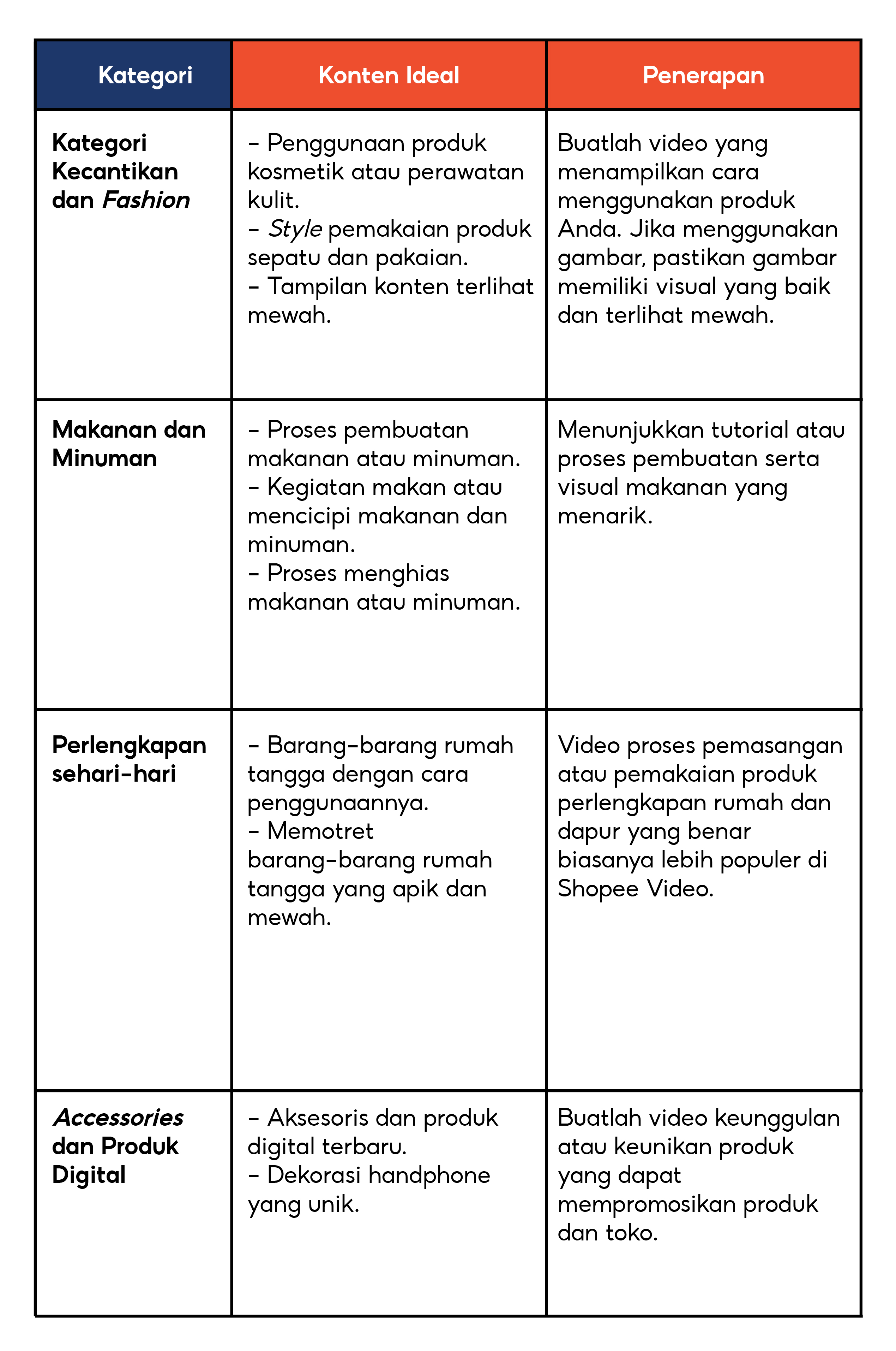Berikut adalah rekomendasi tipe konten pada Shopee Video yang diminati oleh Pengguna yang dapat Anda sesuaikan dengan kebutuhan konten toko Anda: