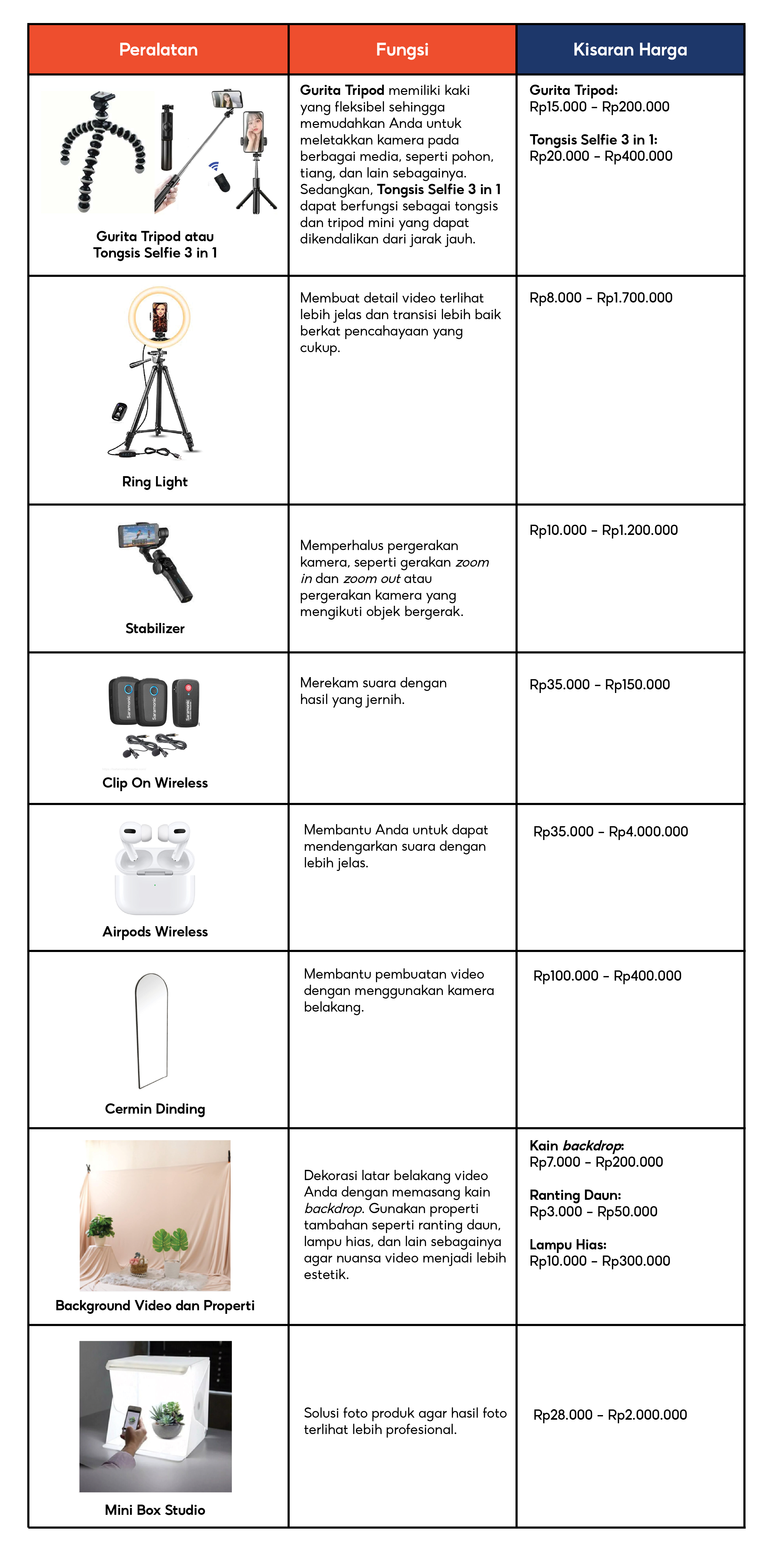 Selain ide konten yang kreatif, Anda juga perlu memperhatikan peralatan untuk membuat konten Shopee Video agar menghasilkan video yang berkualitas dan terlihat profesional. Simak rekomendasi peralatan pada tabel di bawah ini: