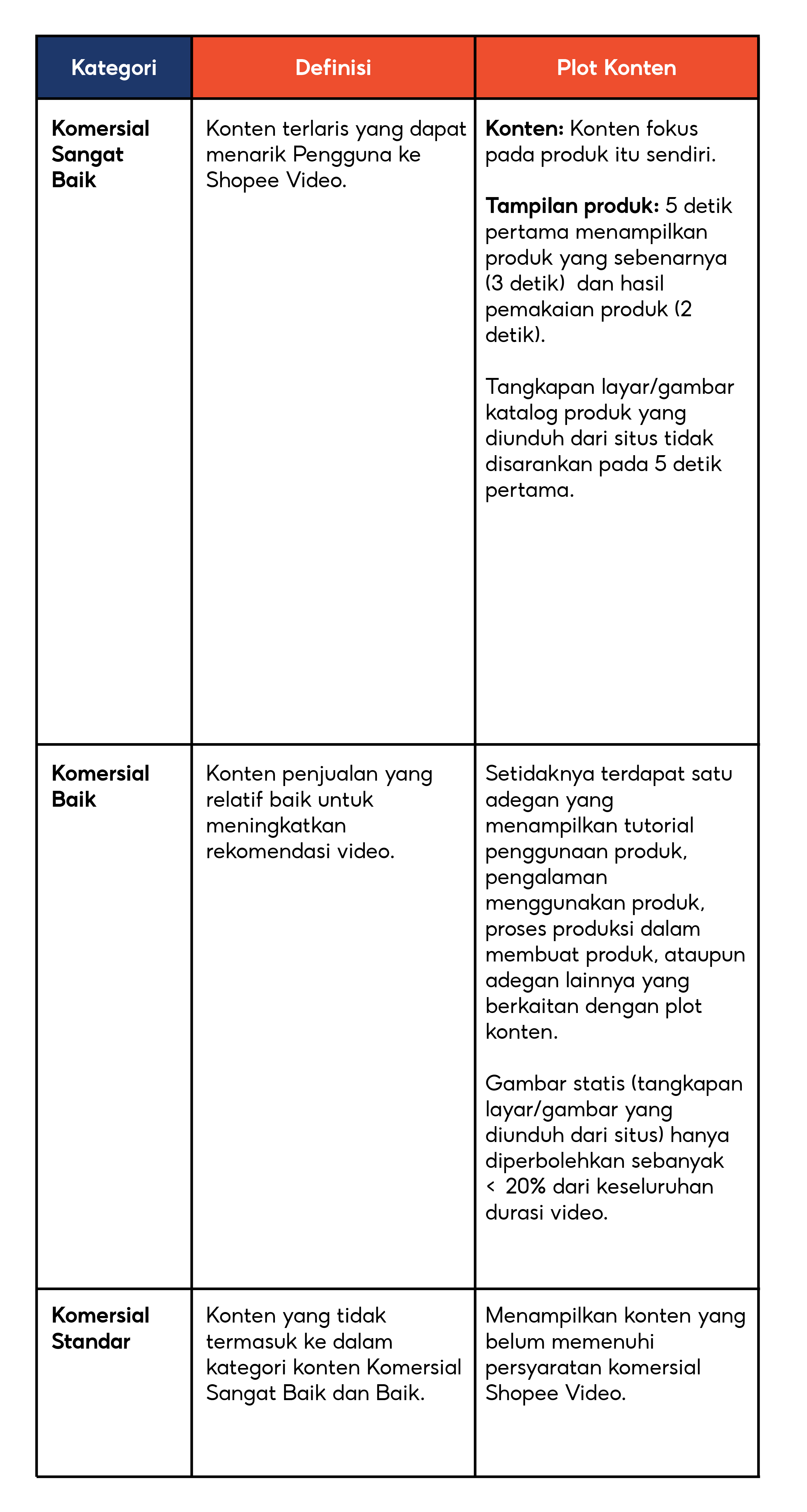 Selain relevansi produk, Anda disarankan untuk membuat konten yang mengandung nilai komersial atau nilai jual yang mampu menarik Pengguna untuk menonton Shopee Video yang Anda unggah. Simak kategori nilai komersial konten pada Shopee Video di bawah ini: