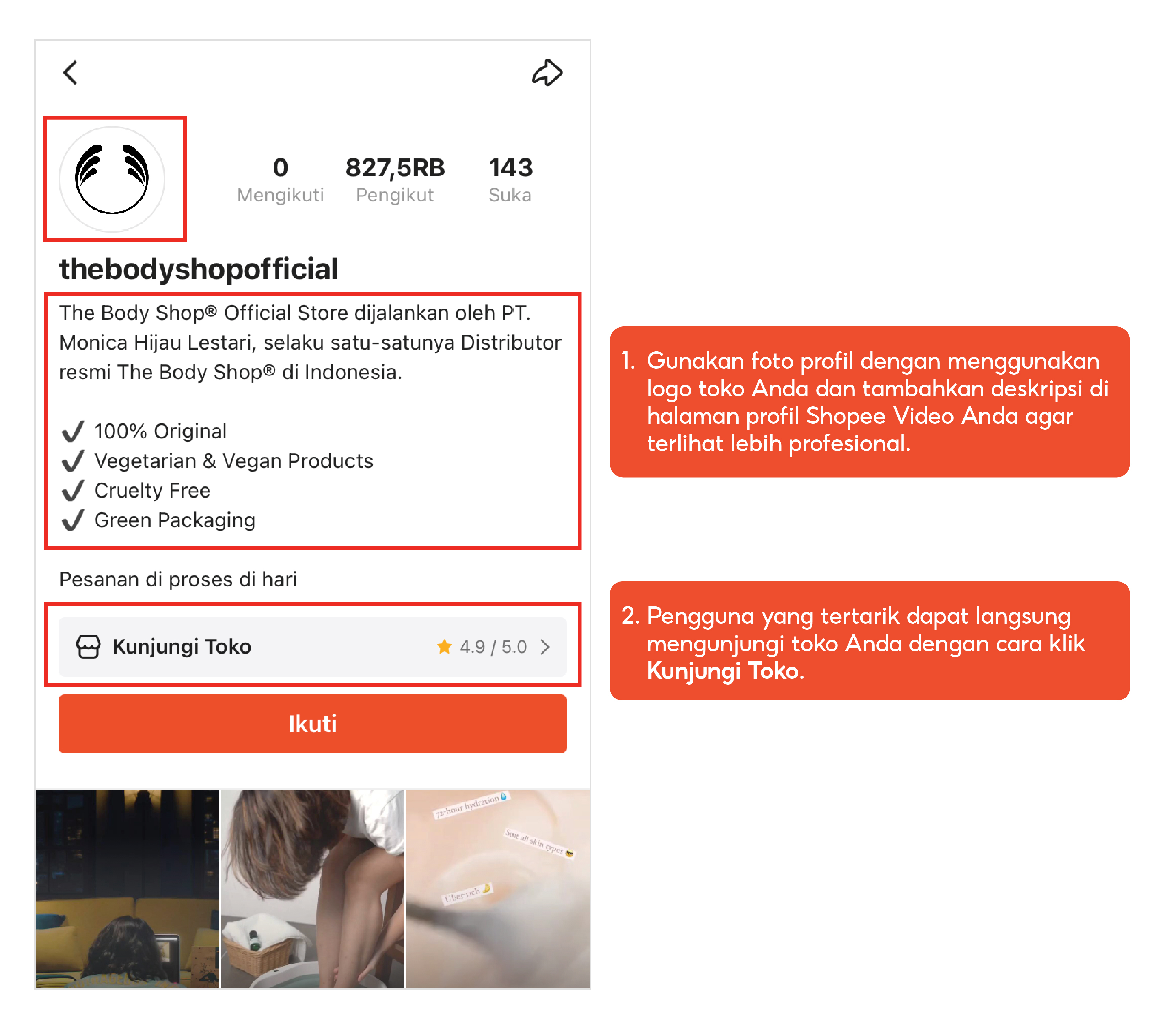 Ketika Pengguna tertarik dengan konten video dan mengunjungi profil Shopee Video Anda, Pengguna dapat langsung melihat halaman toko Anda. Maka dari itu, penting bagi Anda untuk menampilkan foto dan deskripsi yang menarik.