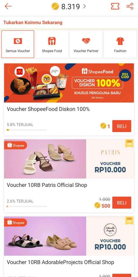 - Voucher tidak dapat dibatalkan apabila Voucher telah tampil di halaman Reward Koin Shopee.