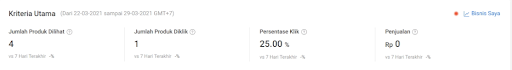 Ringkasan performa Flash Sale Toko Saya juga dapat dilihat melalui Kriteria Utama pada bagian atas halaman Flash Sale Toko Saya.