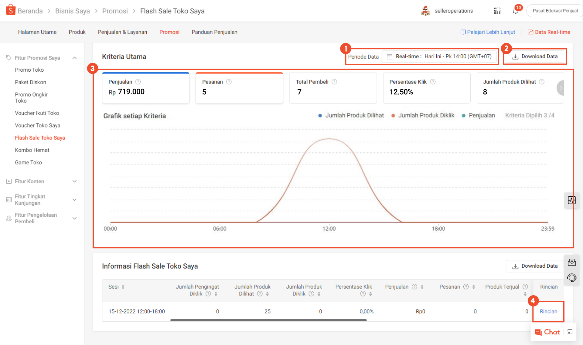 - Anda dapat melihat data performa Flash Sale Toko Saya sesuai dengan kriteria yang tertera.