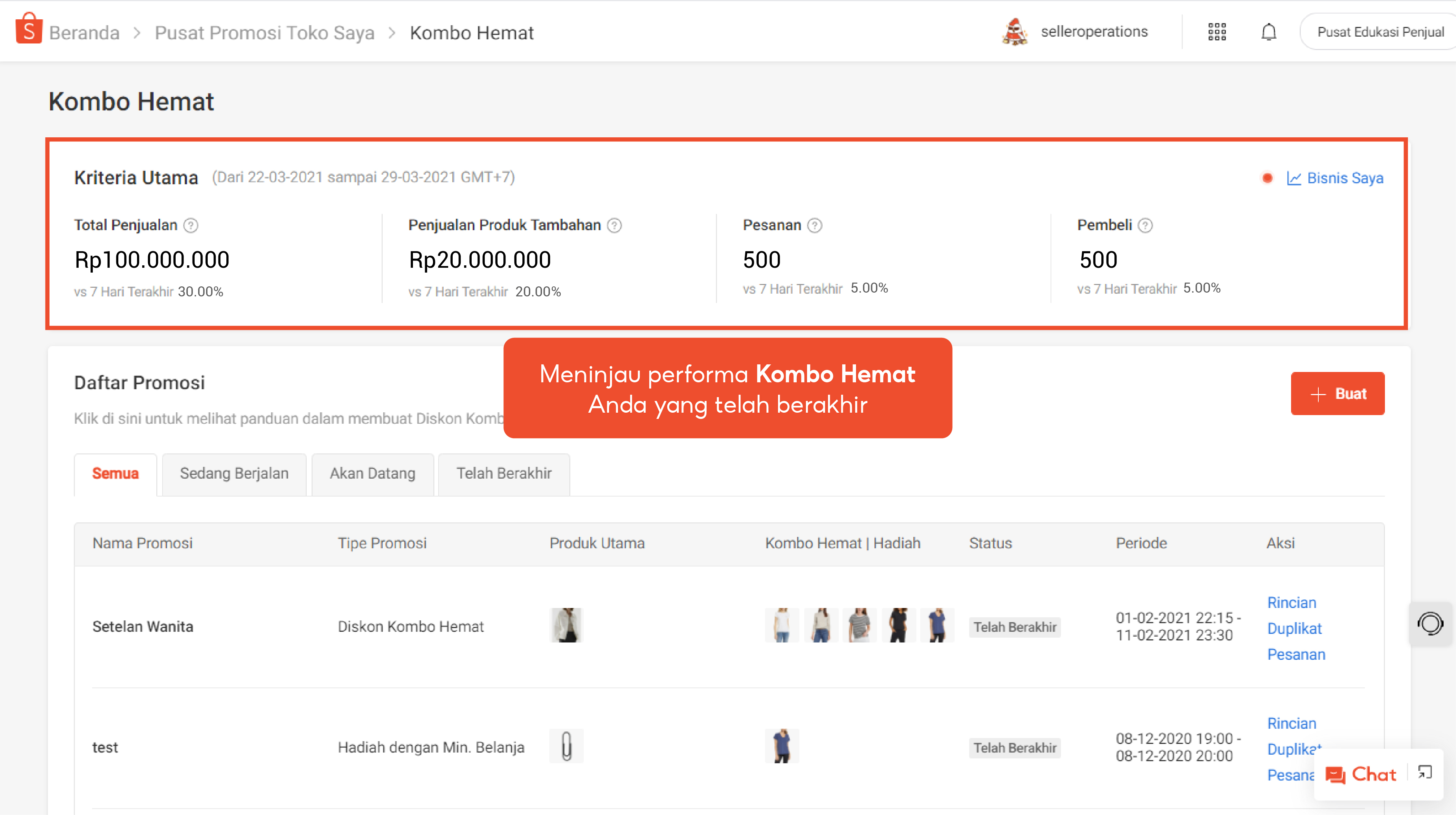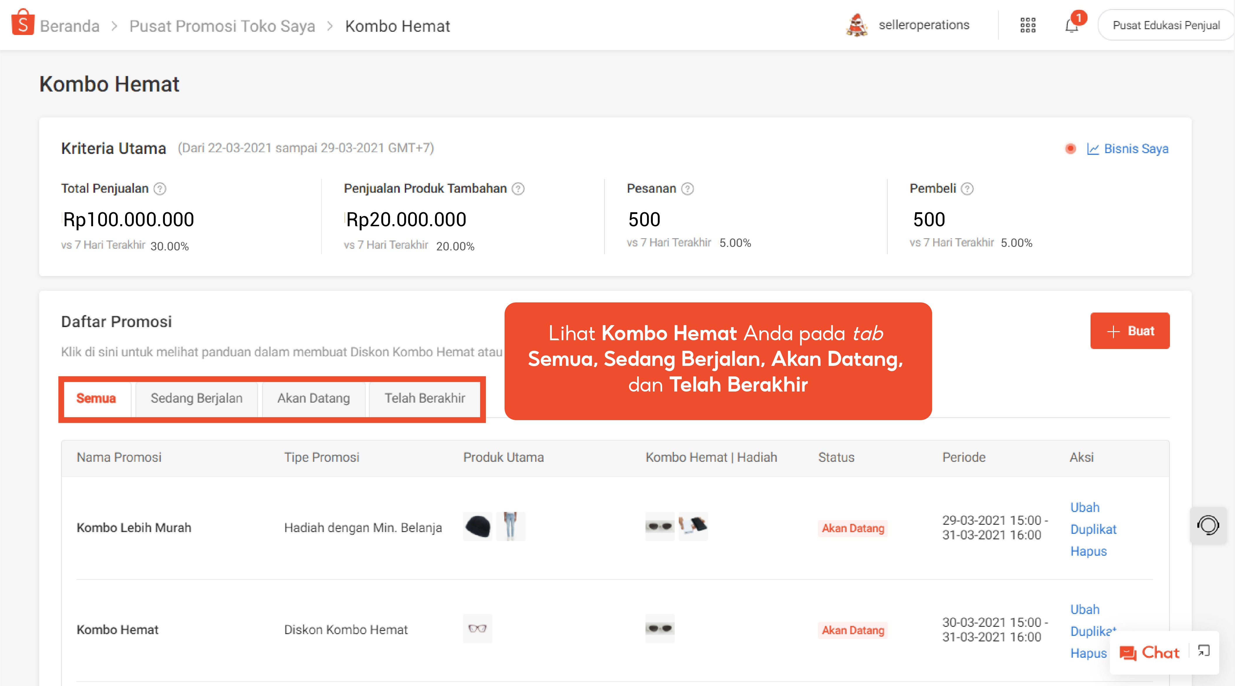 Pada bagian Daftar Promosi, Anda dapat melihat daftar promo Kombo Hemat pada tab Semua, Sedang Berjalan, Akan Datang, dan Telah Berakhir.