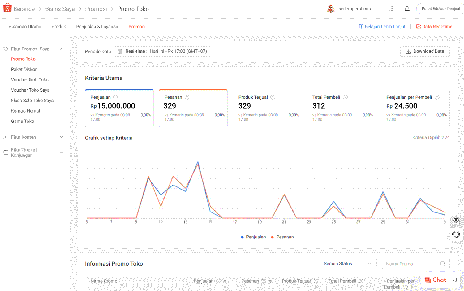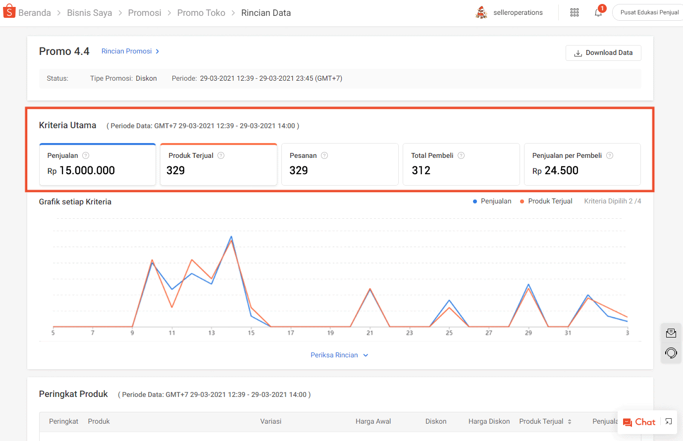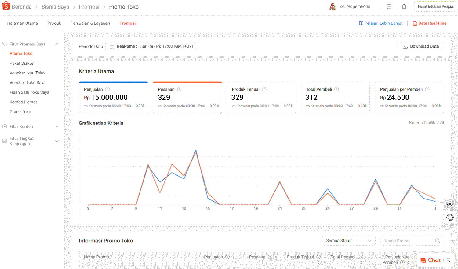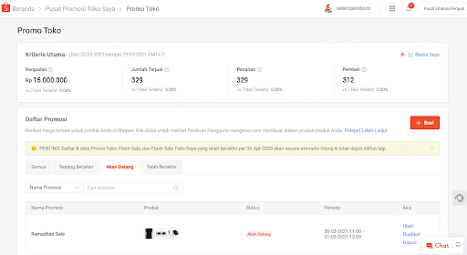 Evaluasi kinerja tiap Promo Toko melalui halaman Bisnis Saya di Seller Centre dengan cara: pilih menu Promosi > pilih Promo Toko > pada bagian Informasi Promo Toko, pilih Data pada Promo Toko yang Anda pilih.