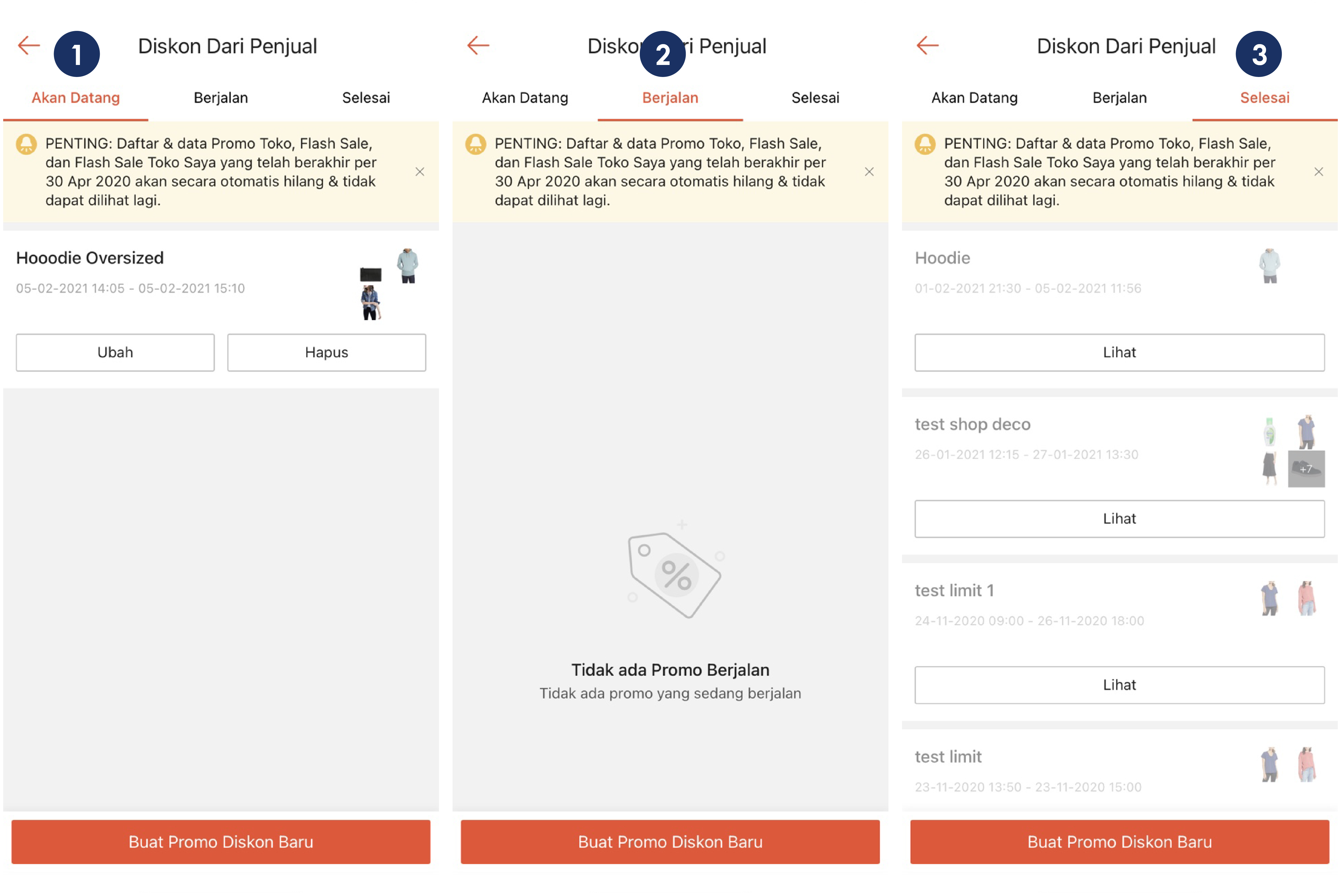 Di halaman Promo Toko, Anda dapat menyortir Promo Toko dengan memilih Akan Datang, Berjalan, dan Selesai.