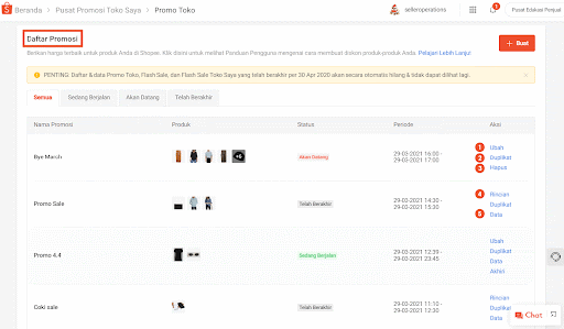 Di halaman Promo Toko, Anda dapat menyortir Promo Toko dengan memilih tab Semua, Sedang Berjalan, Akan Datang, atau Telah Berakhir. Anda juga dapat Ubah, Duplikat, Hapus, lihat Rincian, atau lihat Data Promo Toko dengan mudah.
