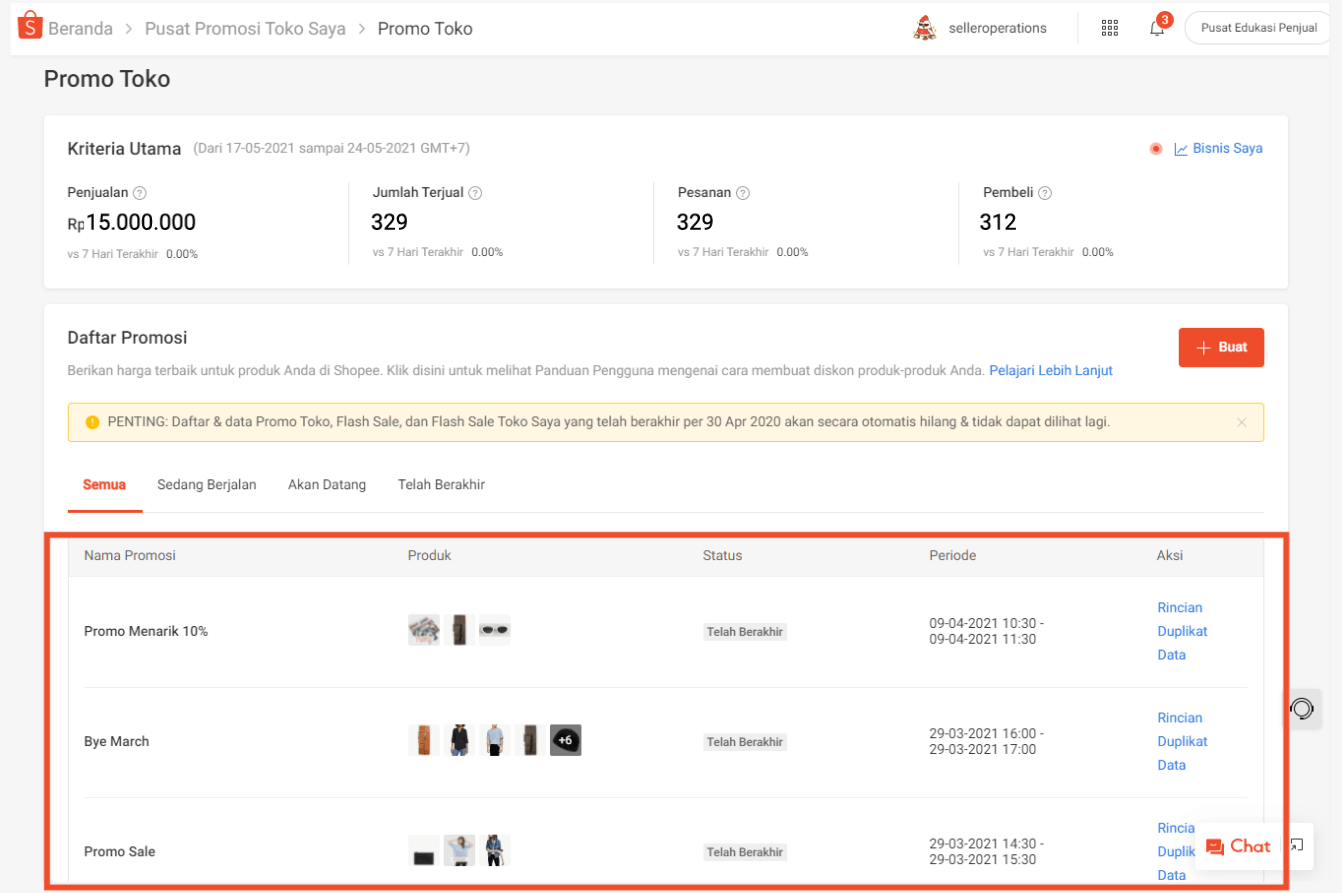 Anda dapat melihat data Promo Toko yang Berjalan dan Telah Berakhir untuk menganalisis informasi lebih lanjut seperti mengenai pesanan dan Pembeli. Data hanya dapat diakses melalui Seller Centre.