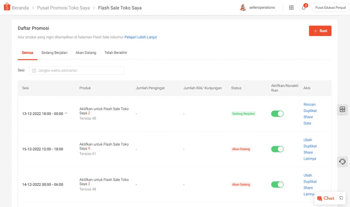 - Periksa kembali Daftar Promosi di halaman Flash Sale Toko Saya untuk memastikan bahwa sesi promosi yang Anda pilih telah aktif untuk ditampilkan.
