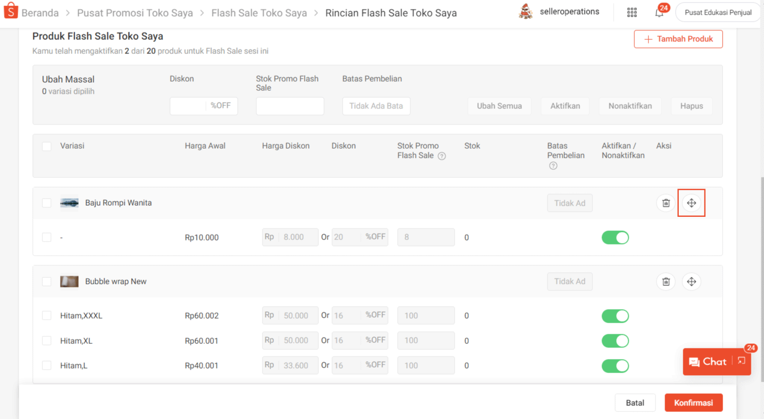 - Periksa kembali Rincian daftar produk di halaman Flash Sale Toko Saya untuk memastikan bahwa produk-produk yang Anda pilih telah aktif untuk ditampilkan.