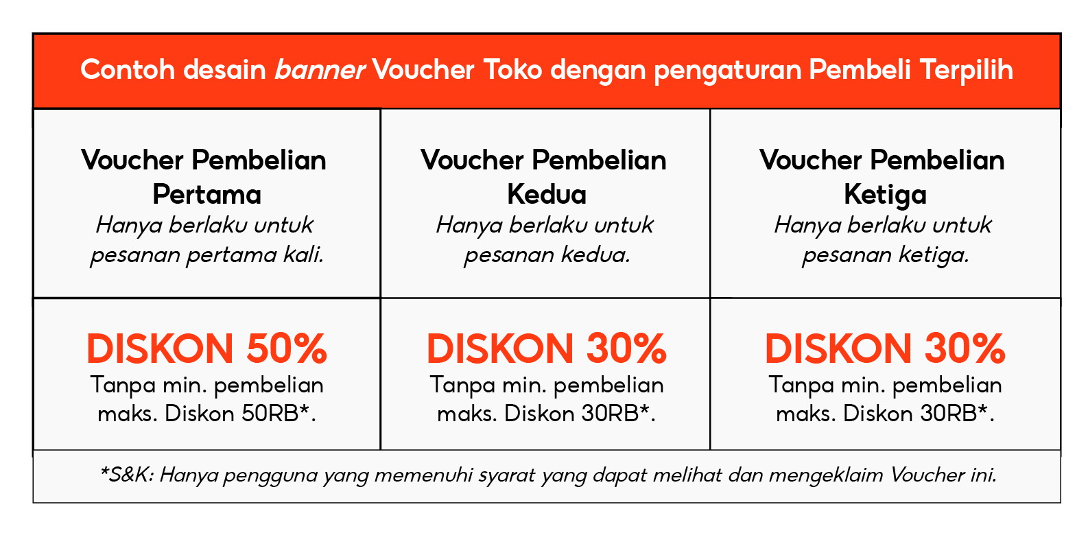 - Tambahkan sub judul “Hanya untuk pembelian pertama/kedua/ketiga” pada masing-masing Voucher untuk menghindari pertanyaan dari pembeli yang tidak memenuhi syarat.