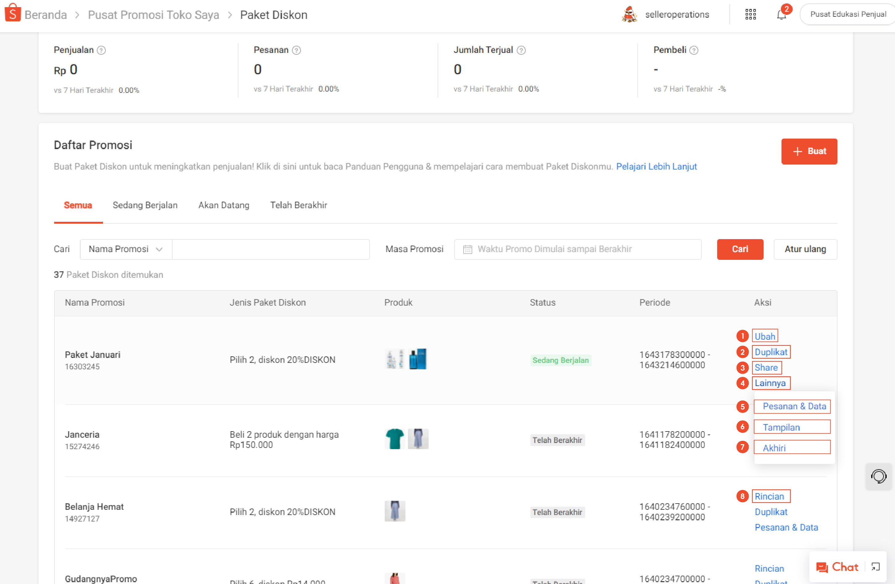 Pilih Lainnya untuk mengambil aksi lainnya pada Paket Diskon yang Sedang Berjalan. Fungsi ini hanya dapat diakses di Seller Centre.