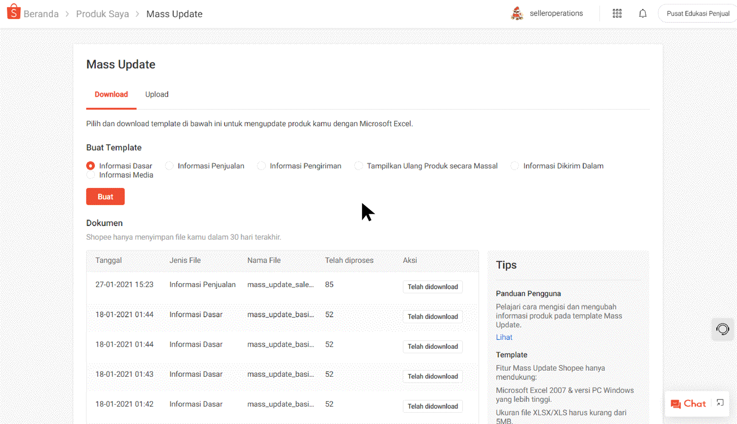 Berikutnya, pilih Download Template untuk meng-upload daftar produk secara massal, isi informasi yang dibutuhkan pada template, lalu upload.