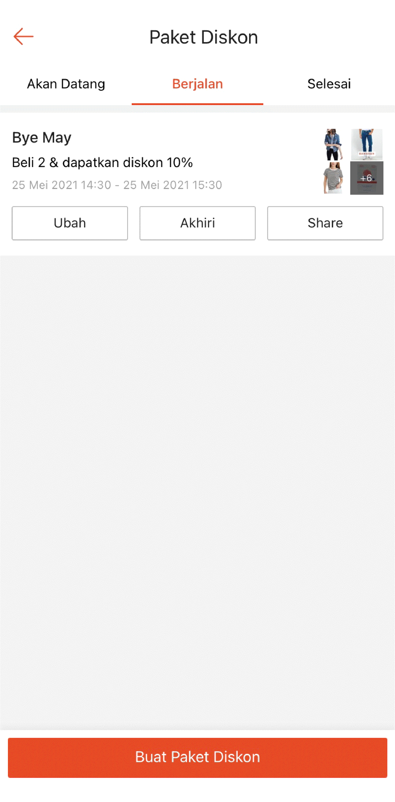 Jika Anda ingin mengakhiri promo yang sedang berjalan, pilih Lainnya lalu klik Akhiri. Pembeli tidak lagi dapat melihat atau menggunakan Paket Diskon tersebut.