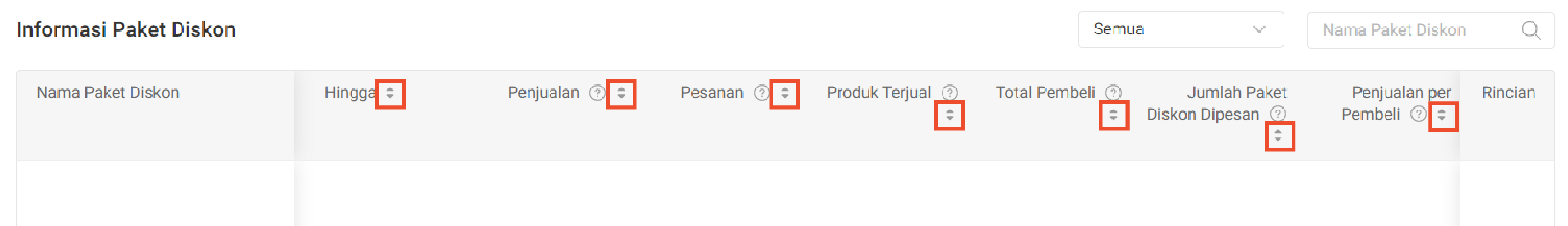 Jika Anda ingin melihat dan membandingkan seluruh Paket Diskon yang telah dibuat, lihat Informasi Paket Diskon. Anda dapat menyortir urutan Paket Diskon dengan klik panah atas bawah yang tersedia untuk mengurutkan metrik tertentu dari yang paling tinggi ke paling rendah. Lihatlah Paket Diskon yang paling efektif dan yang tidak efektif. Anda dapat menduplikat Paket Diskon yang relatif lebih efektif dan mengubah pengelompokan produk, nilai & jenis diskon, atau pun periode Paket Diskon agar lebih efektif di kemudian hari.