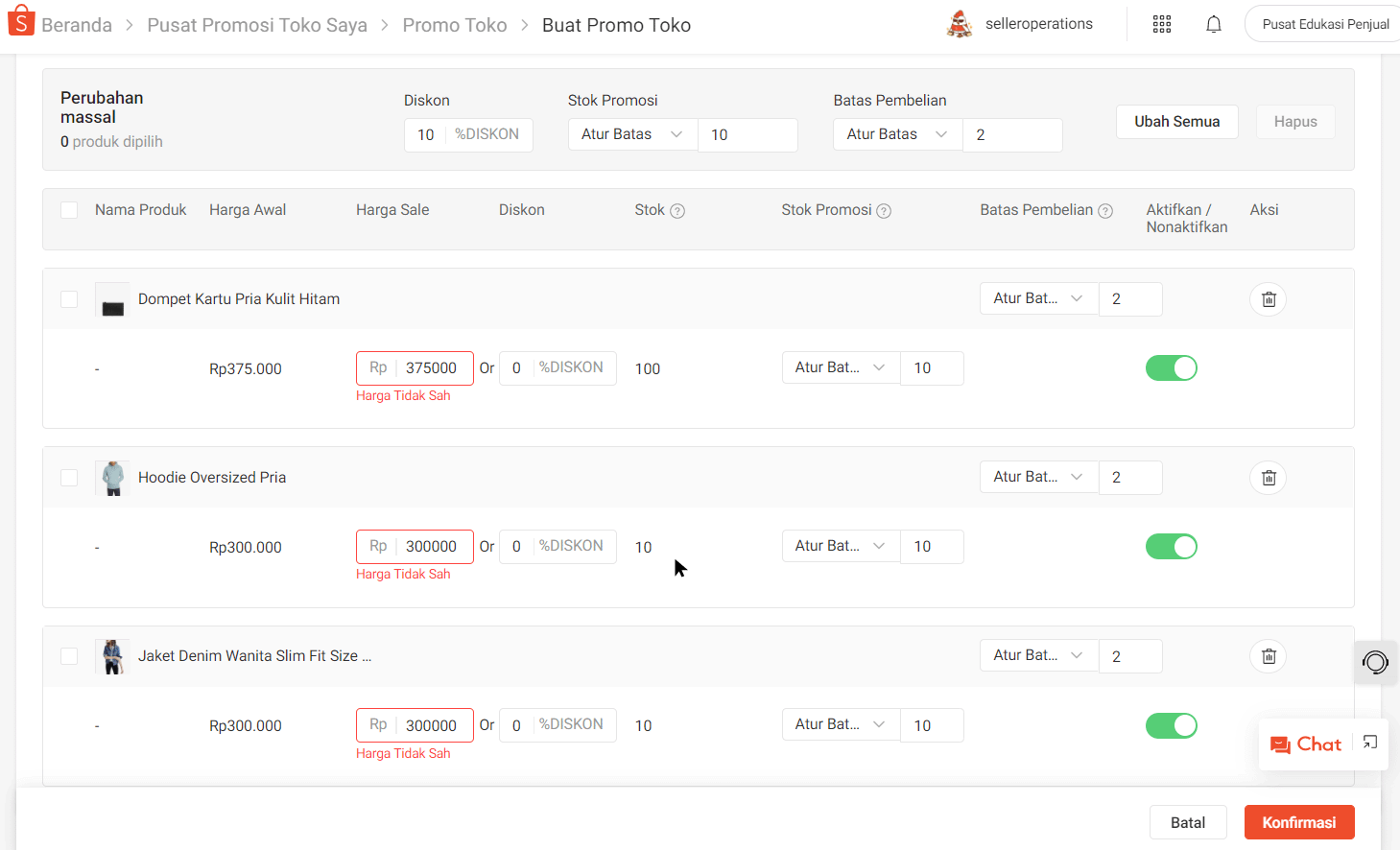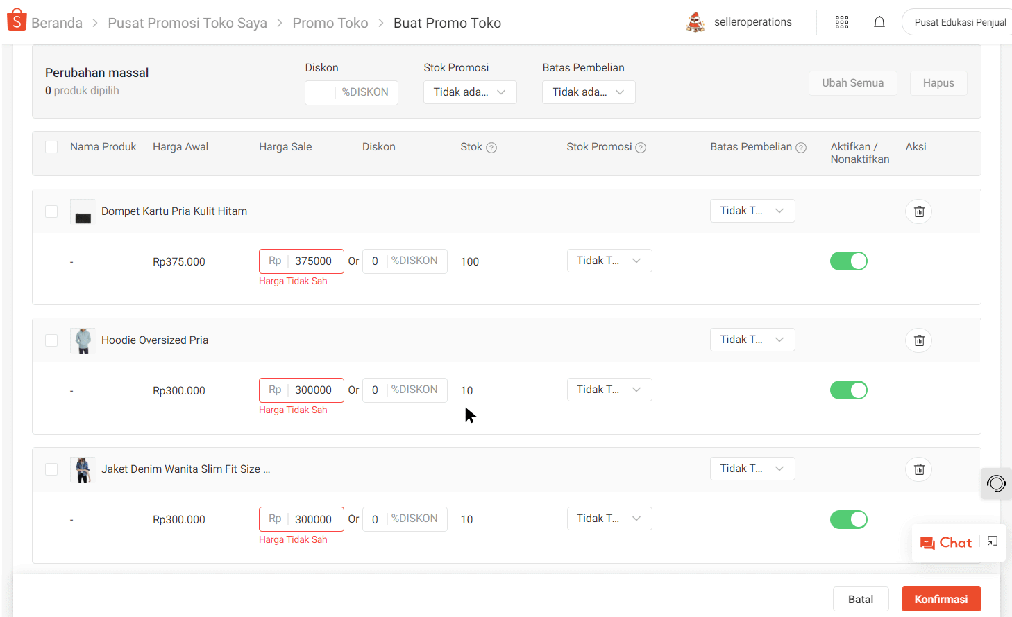 Pada bagian Perubahan massal, isi Diskon, Stok Promosi, Batas Pembelian, dan klik Ubah Semua. Silakan ikuti langkah-langkah di bawah ini.
