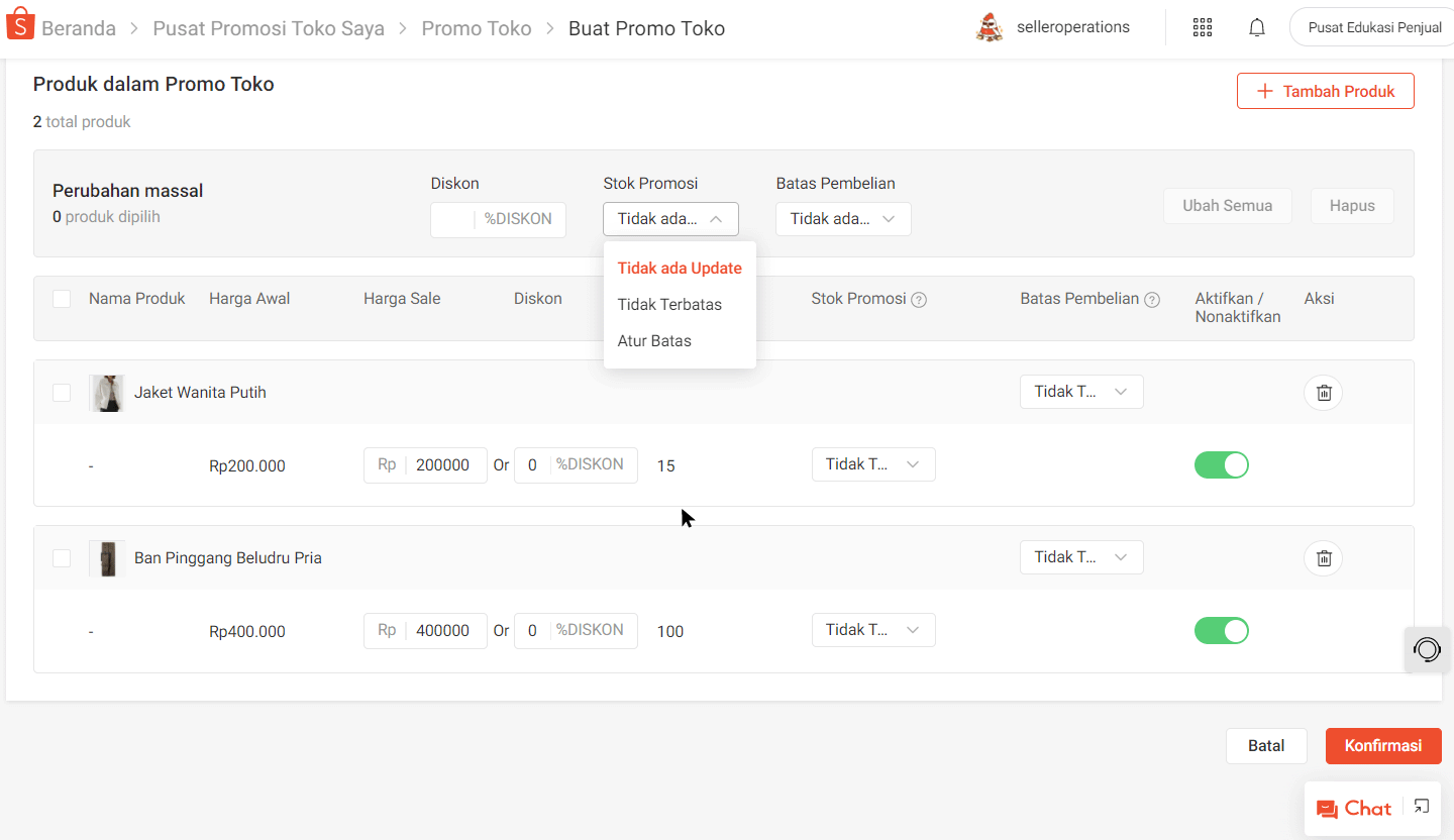 Pada bagian Perubahan massal, isi Diskon, Stok Promosi, Batas Pembelian, dan pilih produk-produk yang ingin Anda perbarui. Setelah itu, klik Update Produk. Silakan ikuti langkah-langkah di bawah ini.