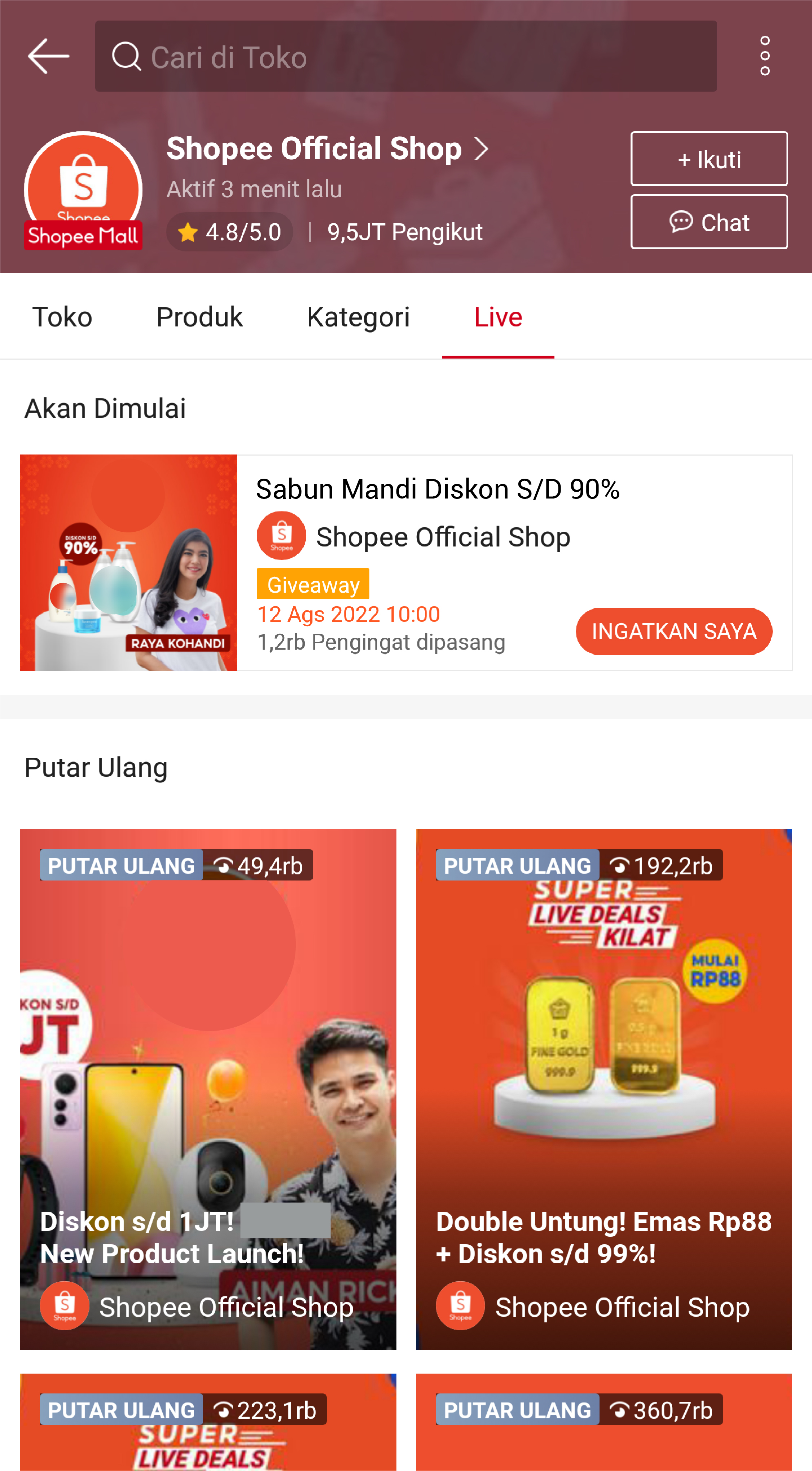 Penjual yang menayangkan ulang sesi streaming akan mempunyai tab Shopee Live di halaman tokonya.